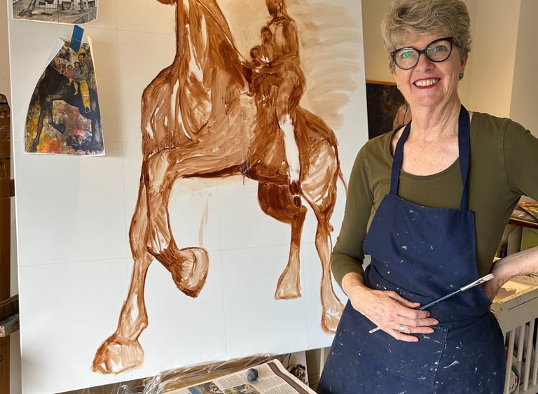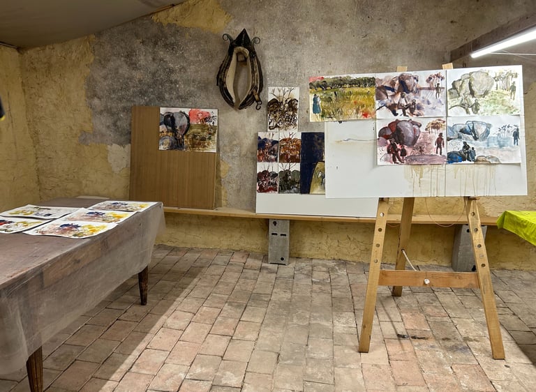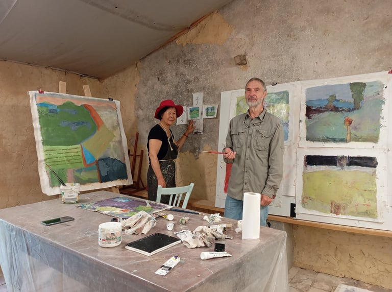 J'ai bénéficié d'une résidence de quinze jours en septembre 2024 dans le magnifique établissement de Kristine et Geoff à Navacelles. J'ai été soutenue principalement par Geoff, un enseignant et artiste très expérimenté, dans le développement d'études pour une série de peintures que j'ai l'intention d'exposer. Ses conseils et ses astuces m'ont été d'une aide précieuse et j'ai eu l'impression d'avoir fait des progrès considérables dans la compréhension de l'orientation de mon travail. Le grand atelier se trouve à l'étage adjacent à la maison, au-dessus des zones de peinture et de sculpture de Geoff, de sorte que j'ai pu travailler sans être interrompue dans un espace calme et bien aménagé.